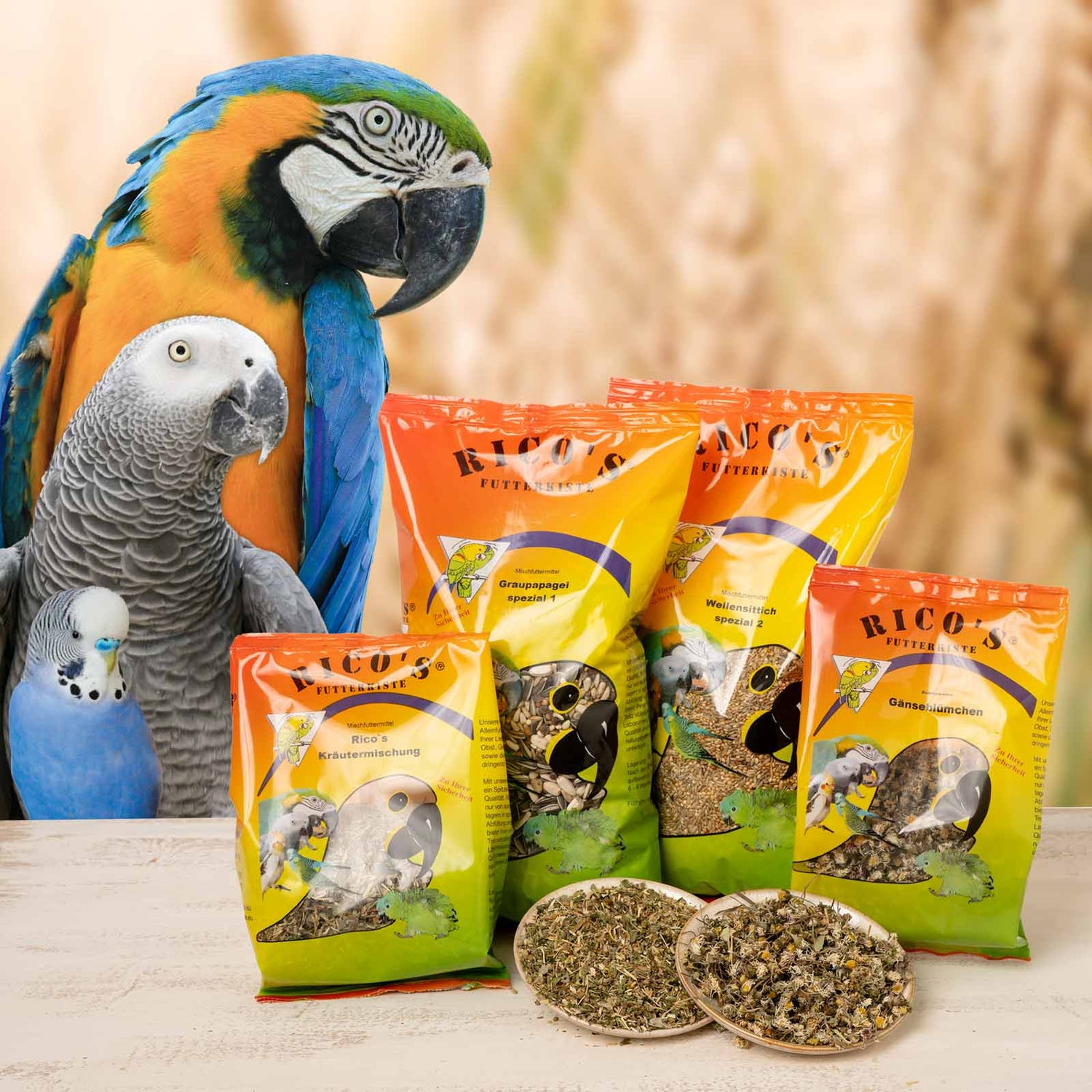 Bei Rico’s Futterkiste könnt ihr die Futtermischungen nach den Vorlieben eurer Vögel ergänzen. Wählt aus einer großen Auswahl an Einzelsaaten, Kräutern, Gemüse-, Blüten und Fruchtmischungen und Baumsaaten – für täglich abwechslungsreiche Mahlzeiten voller Freude.