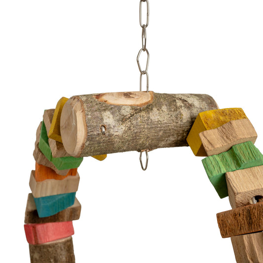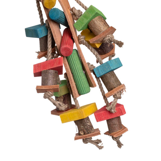 Lederspielzeug mit bunten Holzteilen für Sittiche