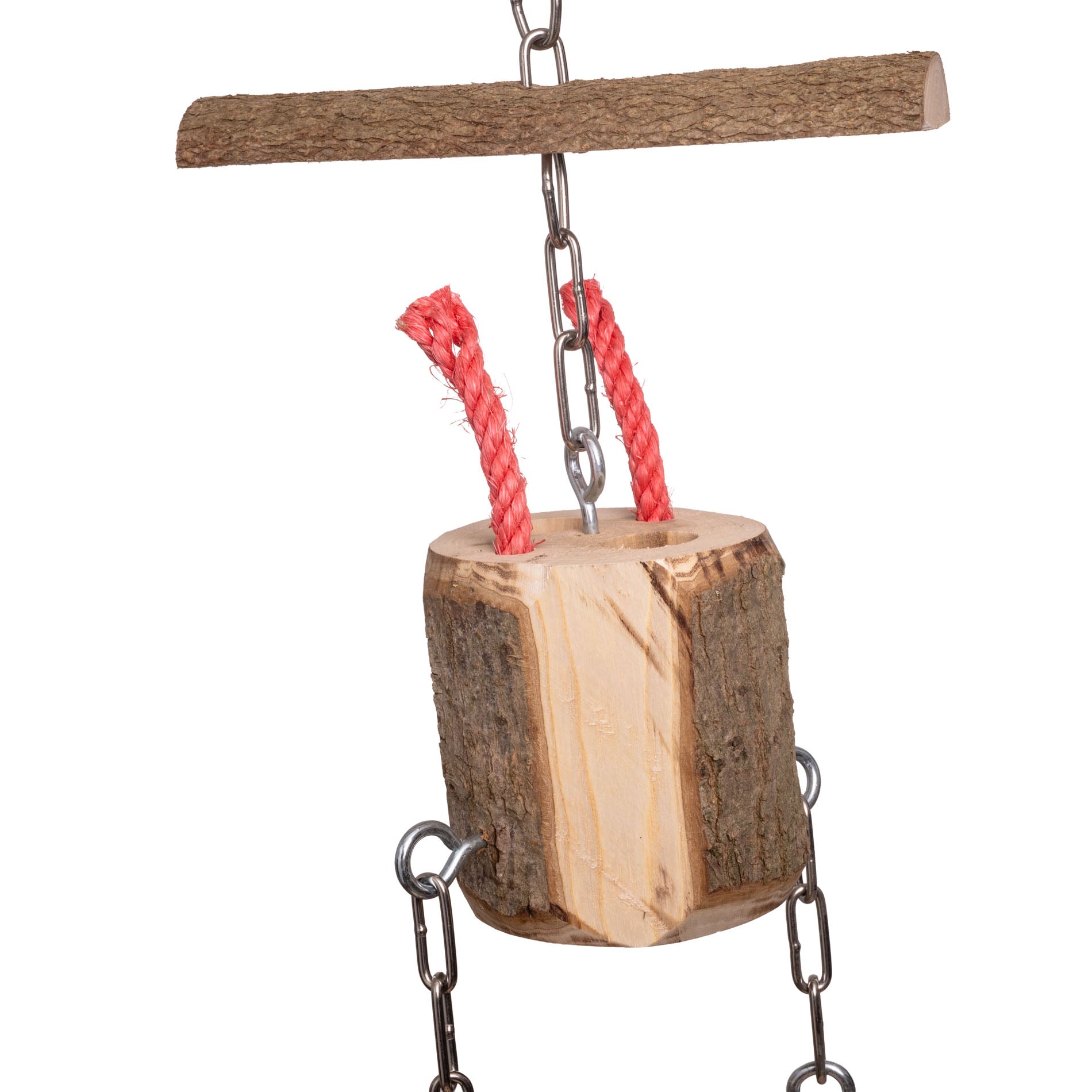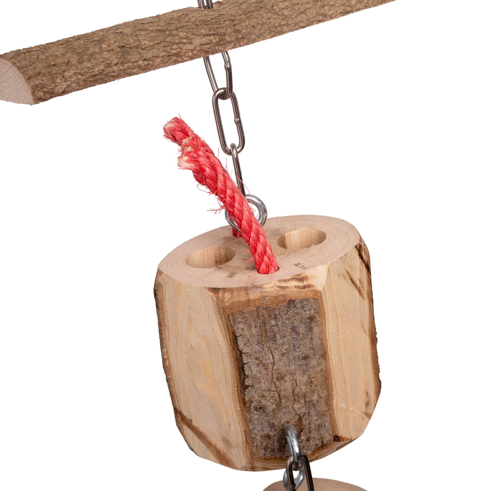 Die stabilen Edelstahlketten verbinden die Klötze sicher miteinander und sorgen für eine lange Lebensdauer. Dank der robusten Aufhängung lässt sich das Spielzeug einfach in der Voliere befestigen. Neben der Beschäftigung unterstützt es die Schnabelpflege und beugt Langeweile effektiv vor.