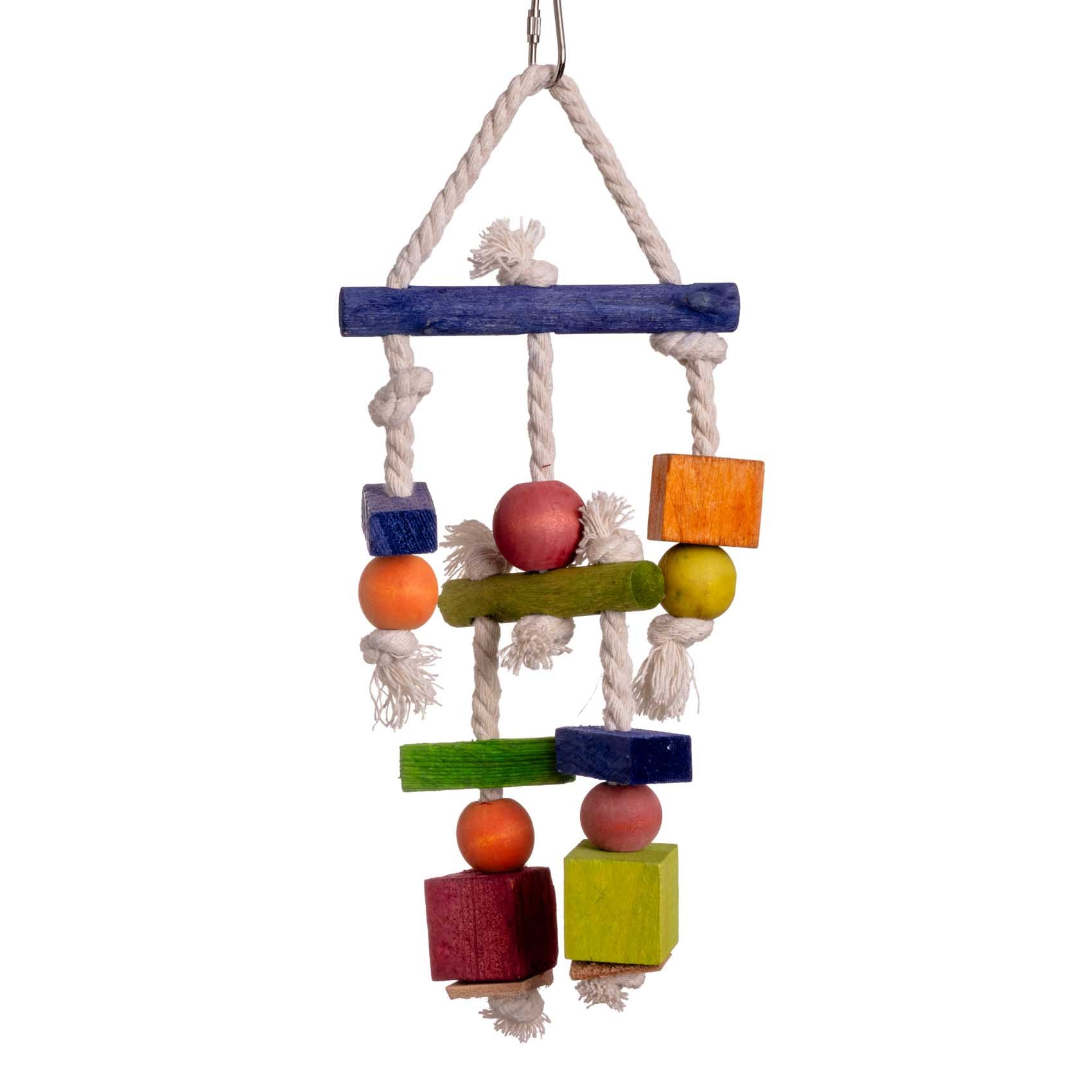 Dieses bunte Holzspielzeug am Tau sorgt bei Sittichen und kleinen Papageien für Kletter- und Knabberspaß.