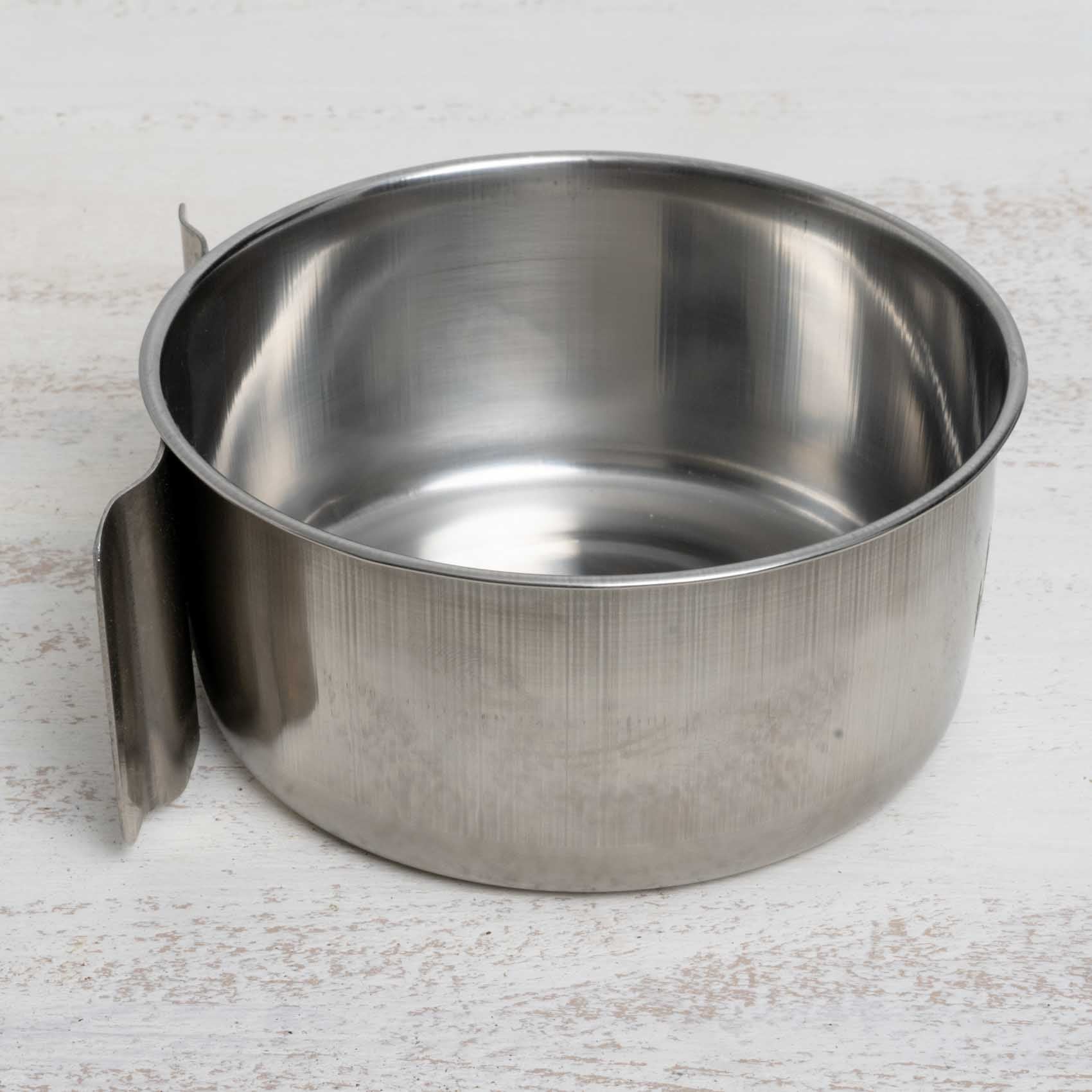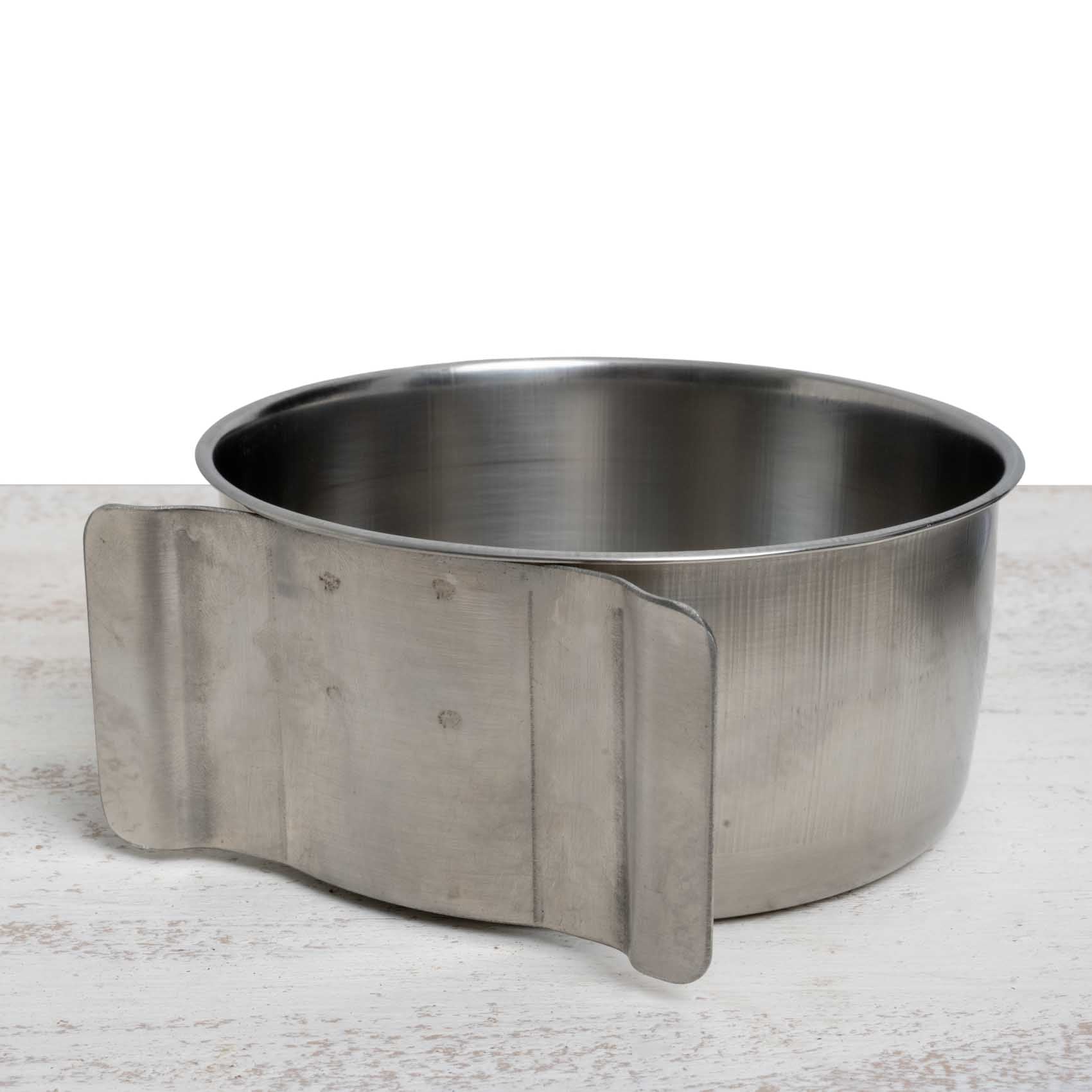 Edelstahlnapf mit Halteplatte zum Einschieben für Gitter- und Wandmontage – robust, hygienisch und einfach zu reinigen.