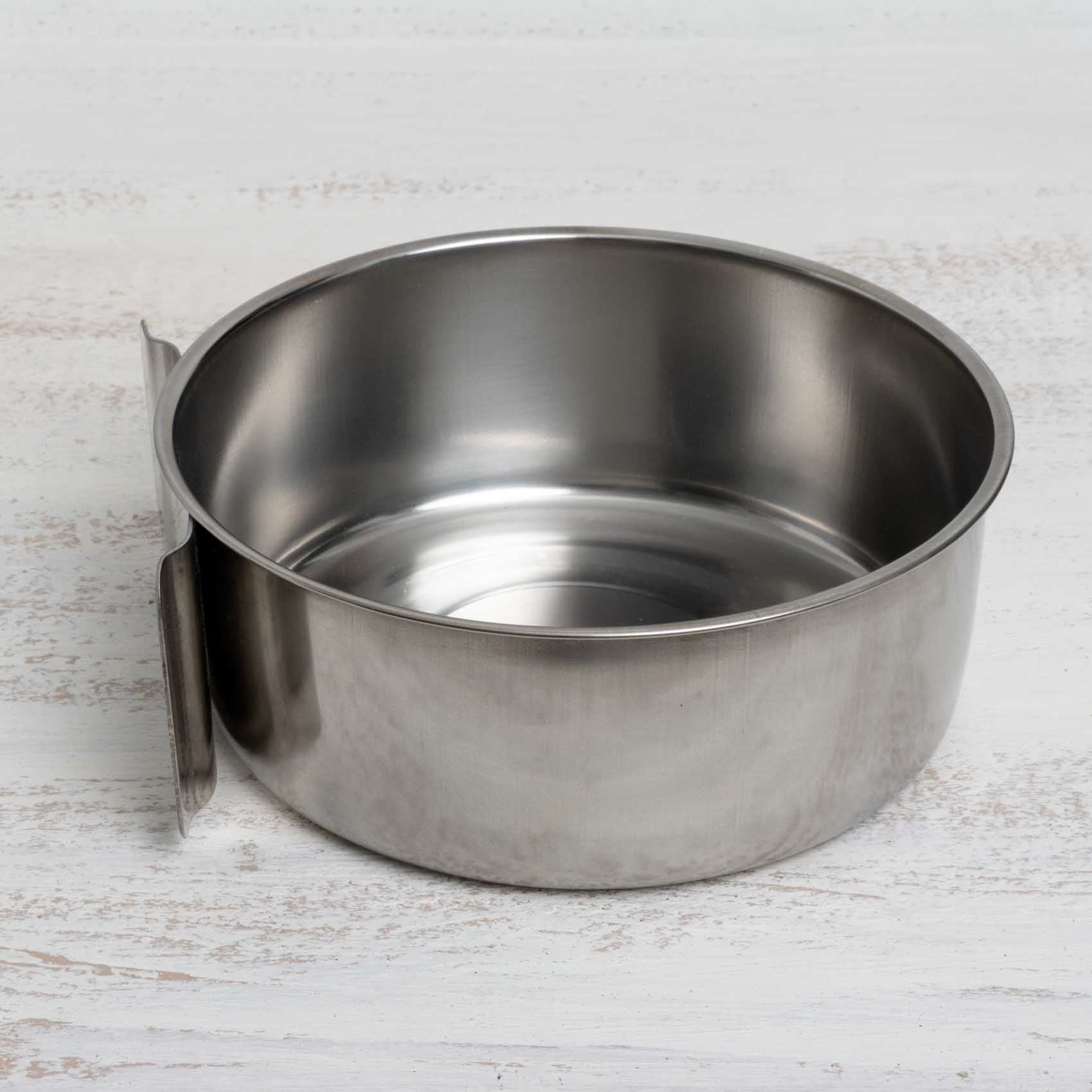 Großer Edelstahlnapf mit Halteplatte zum Einschieben für Gitter- und Wandmontage – hygienisch, aushebelsicher und besonders langlebig.