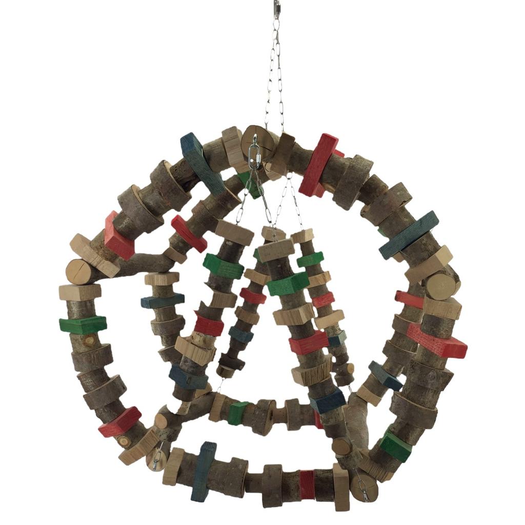 Gigantisches Papageien Schaukelrad mit 5 Naturholzsprossen und reichlich Knabberholz in bunt und naturbelassen.