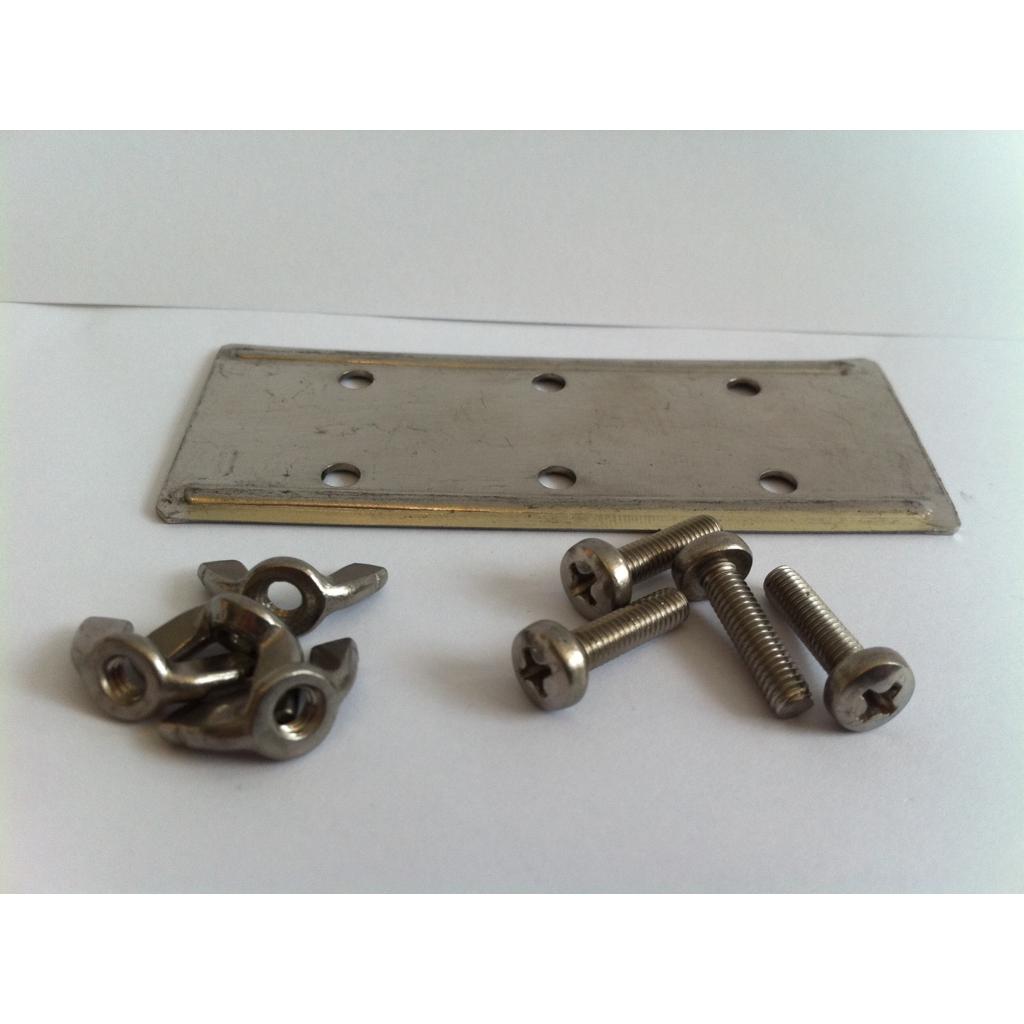 Konterlatte für Edelstahlnapf, 4 Edelstahlschrauben,4 Edelstahlflügelmuttern und Edelstahlplatte>br> Die Konterplatte wird benötigt, sofern Sie den Napf an einem Gitter befestigen wollen.