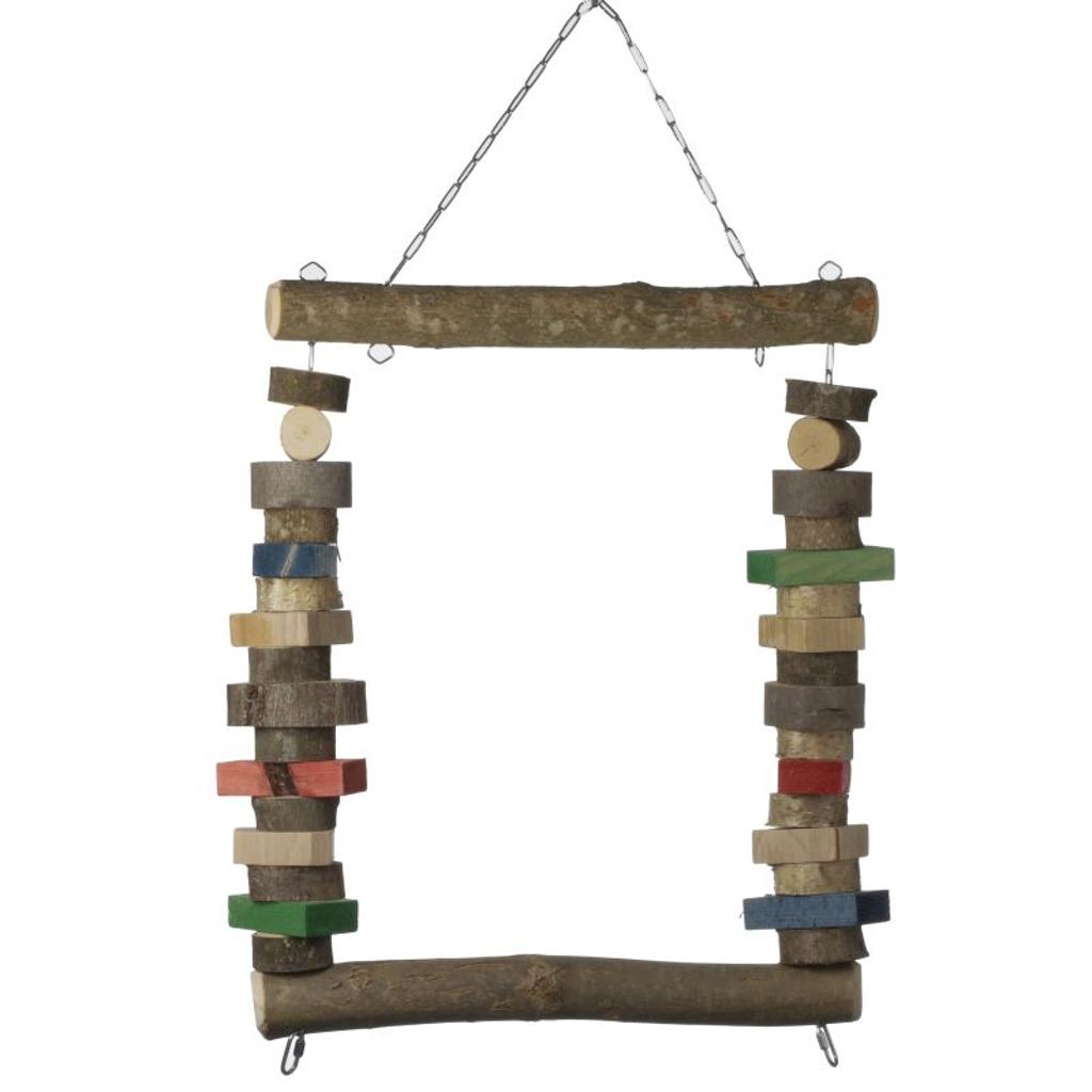 Große Papageien Schaukel mit 2 dicken Naturholzstangen und reichlich Knabberholz in bunt und natur aus Edelstahlketten.