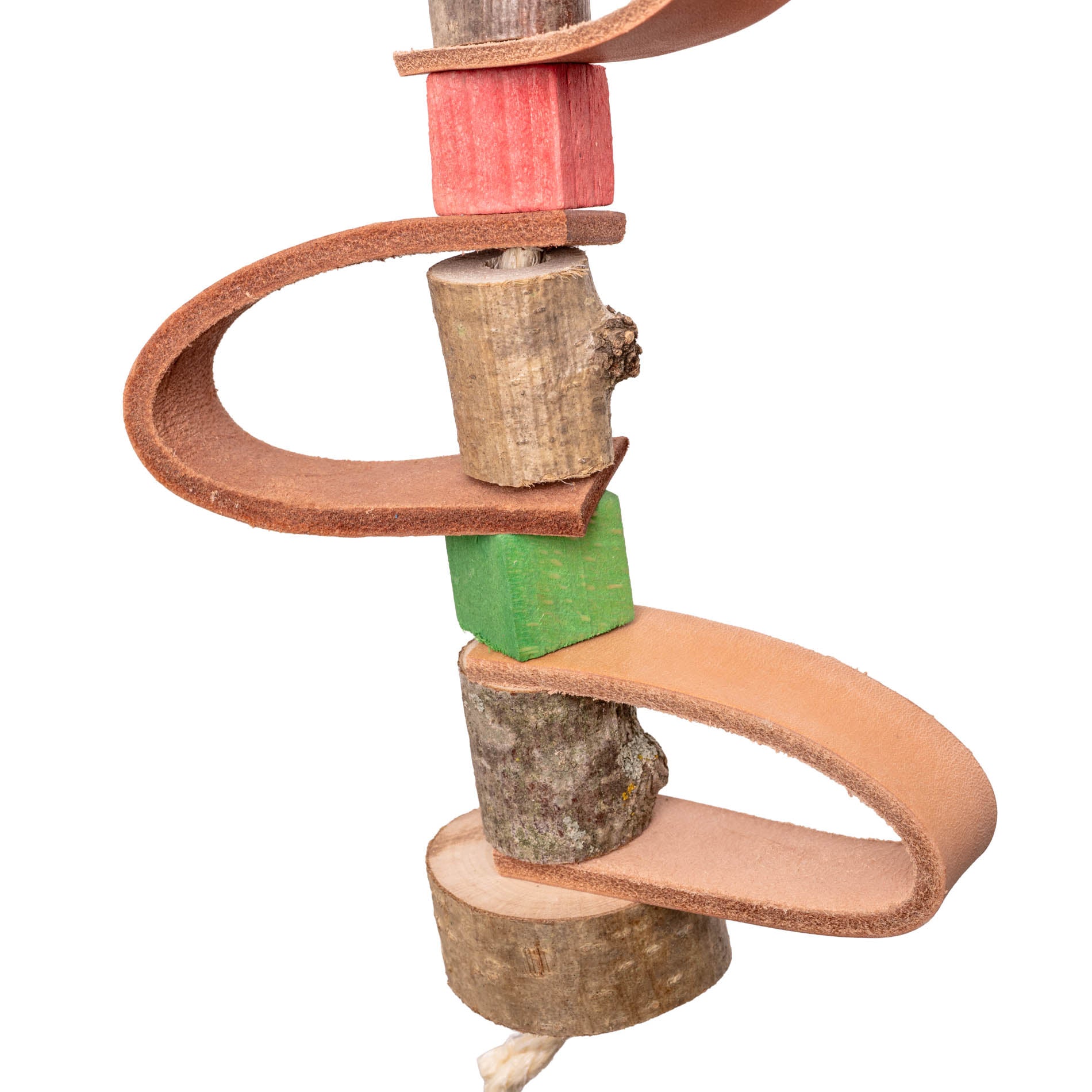 Dieses vielseitige Spielzeug kombiniert ein geschwungenes Lederband mit Naturholzteilen, die teils bunt mit lebensmittelechten Fruchtfarben gefärbt und teils naturbelassen sind. Die Teile sind sicher an einer robusten Sisalschnur befestigt. Ideal geeignet für Sittiche und kleine Papageien.