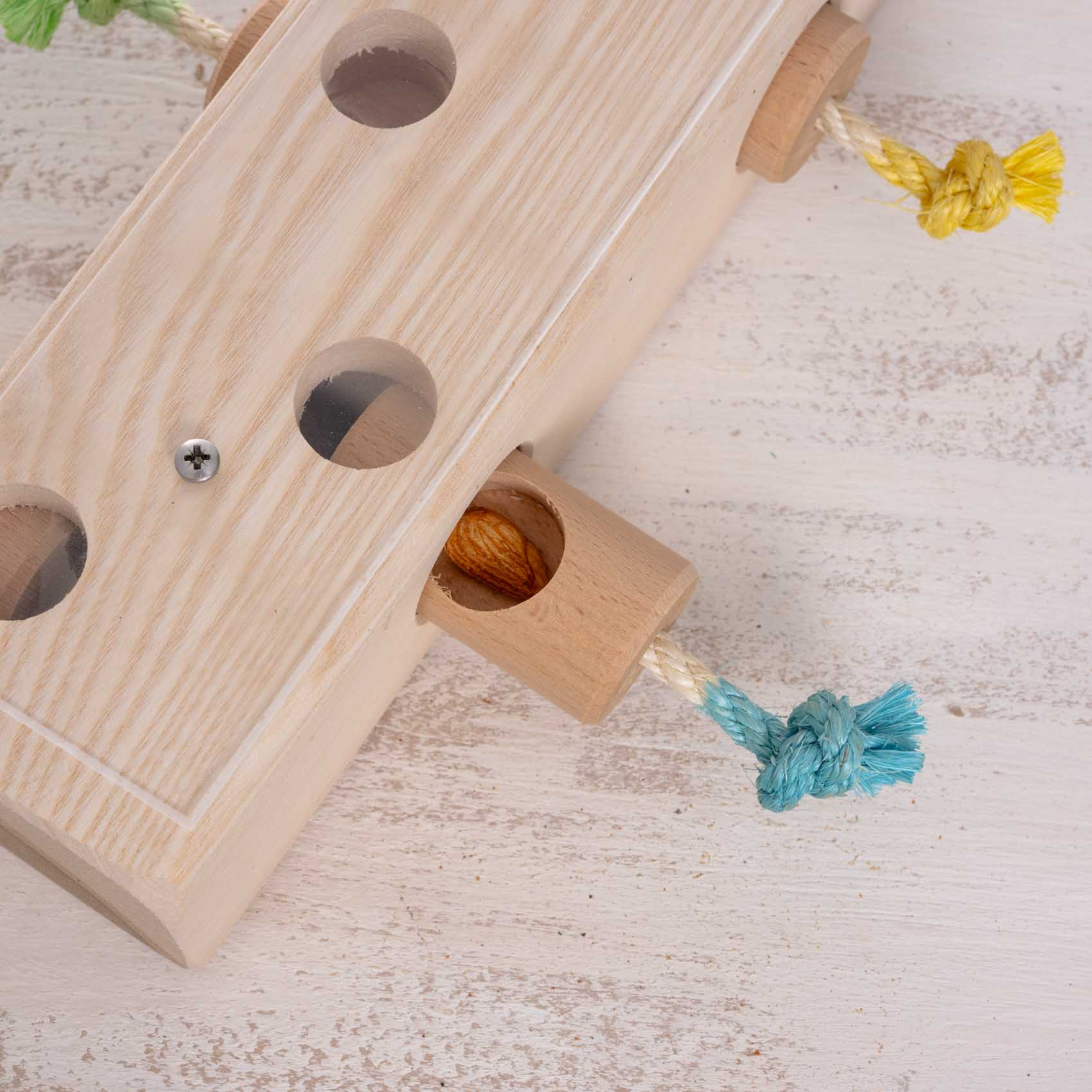 Der Futterklotz besteht aus robustem deutschem Hartholz und ist teilweise naturbelassen, teilweise mit lebensmittelechten Fruchtfarben gefärbt. Die hochwertige, stabile Verarbeitung sorgt für Langlebigkeit und sicheren Spielspaß.