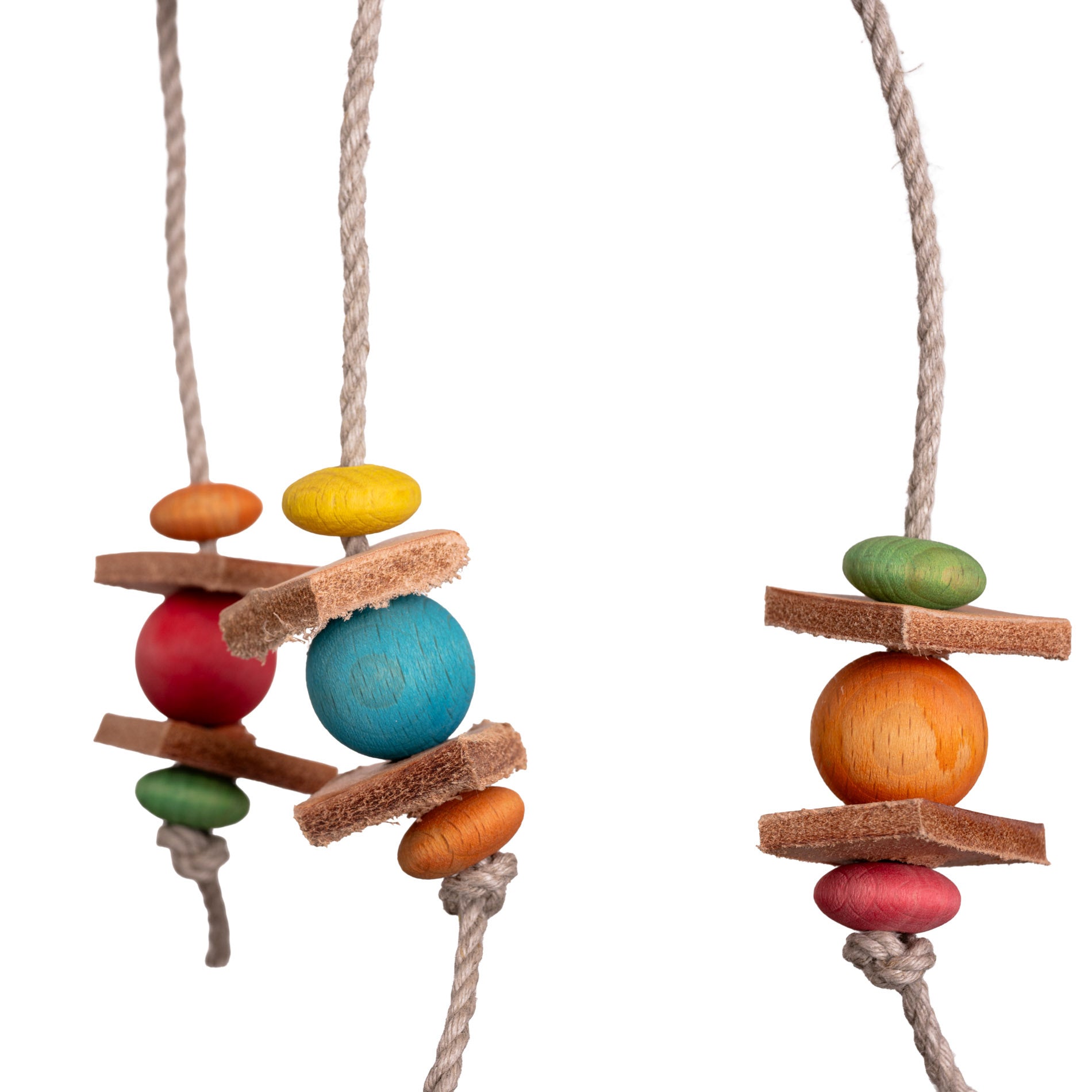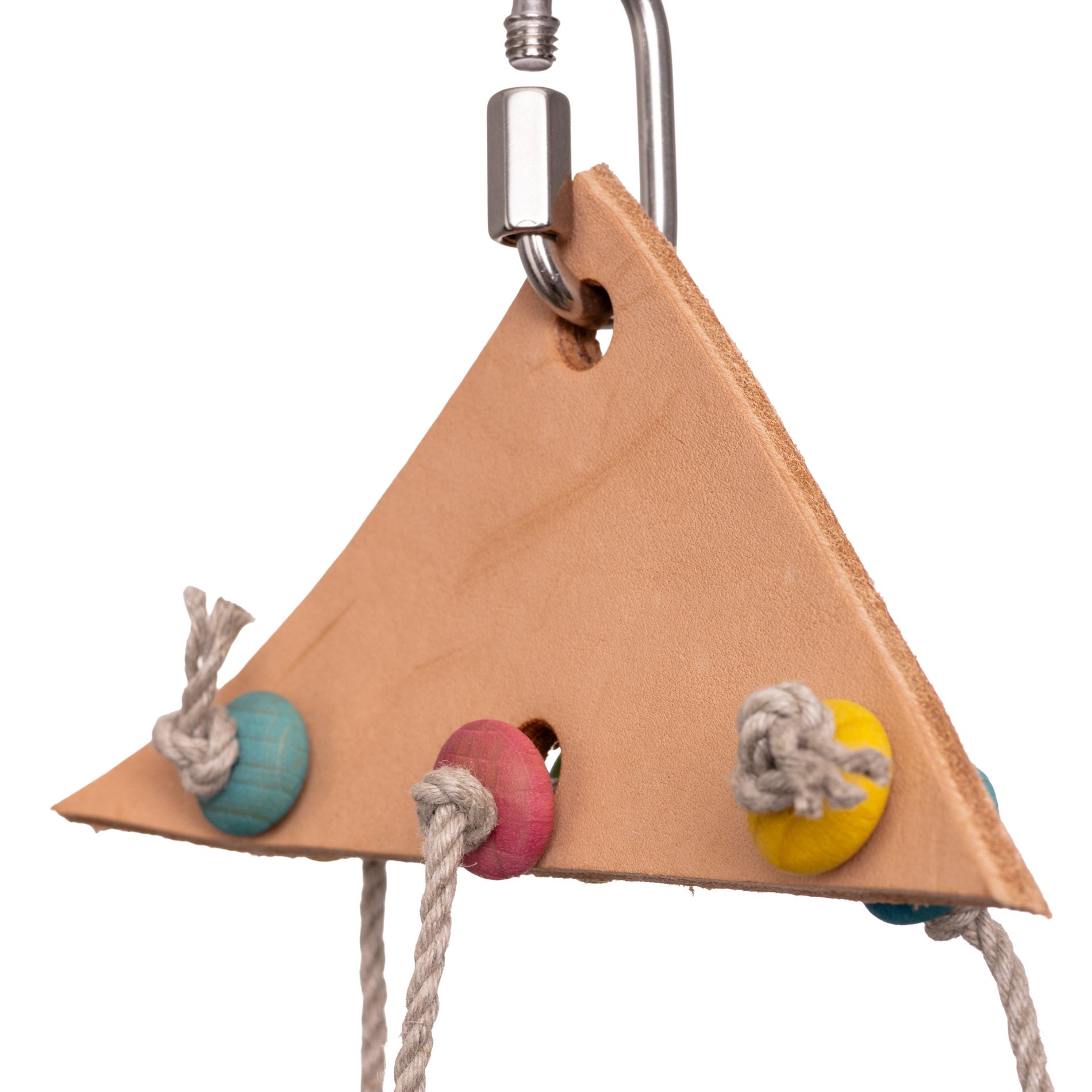 Dieses kleine Lederdreieck ist ein abwechslungsreiches Spielzeug für Sittiche und kleine Papageien wie Wellensittiche, Nymphensittiche, Agaporniden und Sperlingspapageien. Mit Sisalschnüren, bunten Buchenholzperlen und Lederstückchen bietet es vielfältige Beschäftigungsmöglichkeiten zum Klettern, Schreddern und Erkunden.