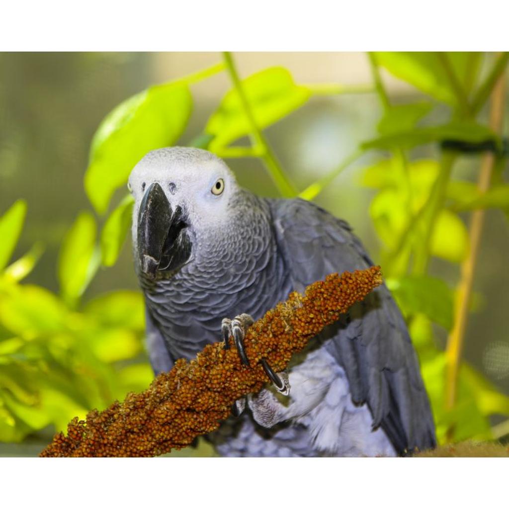 Hirsefütterung: Die Hirse wird im Handel in einer Vielzahl von Arten angeboten, deren überwiegender Teil in den wärmeren Regionen der Erde angepflanzt wird. Unabhängig von Farbe und Größe besitzen alle Hirsen einen ähnlichen Gehalt an einzelnen Nährstoffgruppen, der allgemein mit dem des entspelzten Getreides vergleichbar ist. Eine Ausnahme machen nur die Kolben- und Rispenhirse, die wegen ihres hohen Rohfaseranteils dem Spelzhafer ähneln. Wegen ihres einheitlichen Nährstoffgehaltes können die verschiedenen Hirsearten beliebig gegeneinander ausgetauscht werden. Als Maßstab hat lediglich zu gelten, daß die Körner angenommen werden und diese in ihrer Größe zu Schnabel passen. Besonders gern wird Hirse angenommen, wenn sich diese noch in den Rispen befindet. Es ist anzunehmen, daß sich die Reproduktionsorgane hier besonders lange frisch halten, da Verletzungen des Korns durch den Dreschvorgang und Reibung der Körner untereinander fehlen. Hirse im halbreifen Zustand ist ein besonderer Leckerbissen leider schwer zu bekommen und nur sehr begrenzt haltbar.