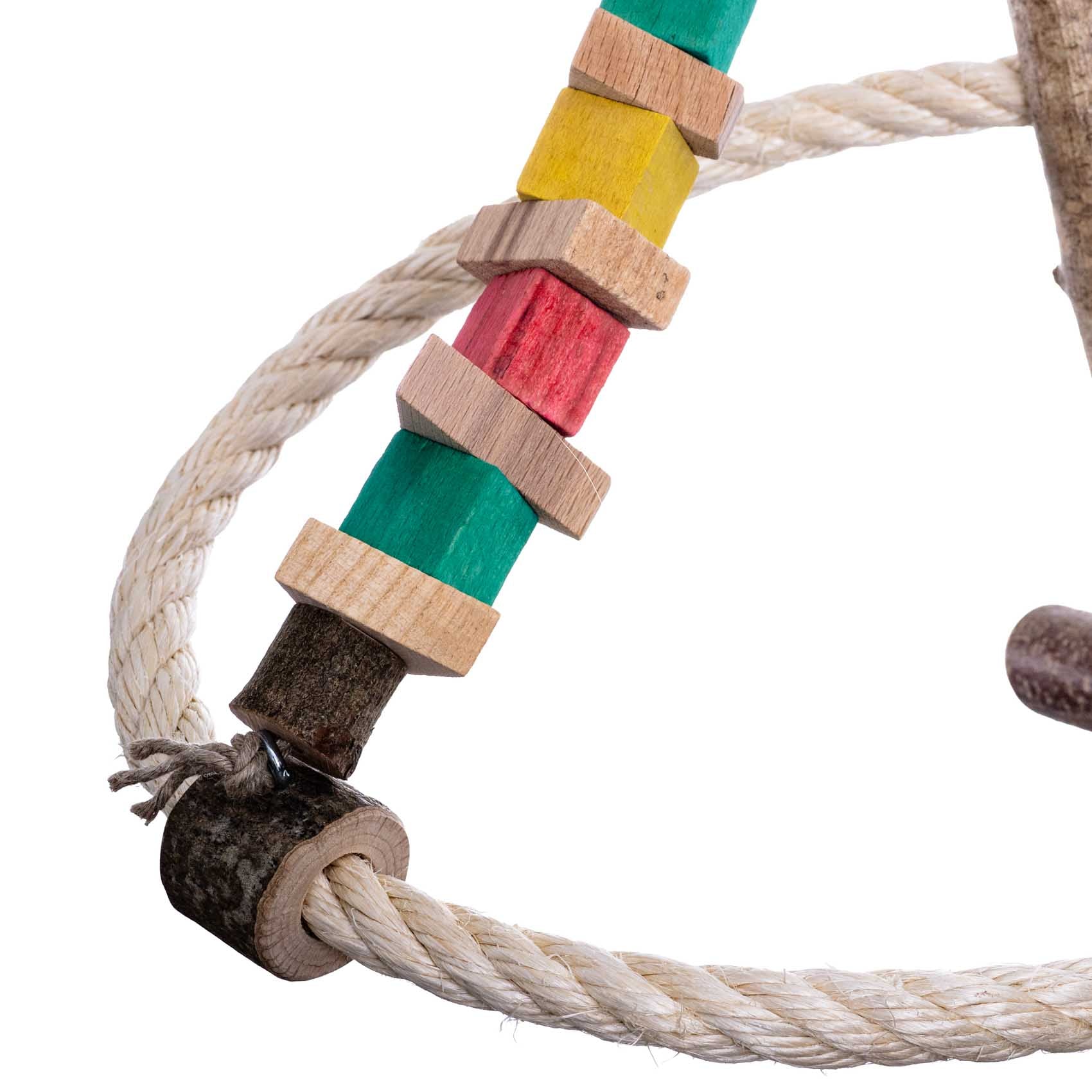 Diese Sisal-Pyramiden-Schaukel aus 16 mm dickem Natur-Sisalseil bietet abwechslungsreichen Schaukel- und Kletterspaß für Wellensittiche, Katharinasittiche und andere kleine Papageien. Die farbigen Knabberholz-Elemente bestehen aus heimischem Hartholz, teilweise naturbelassen oder mit lebensmittelechten Fruchtfarben gefärbt.