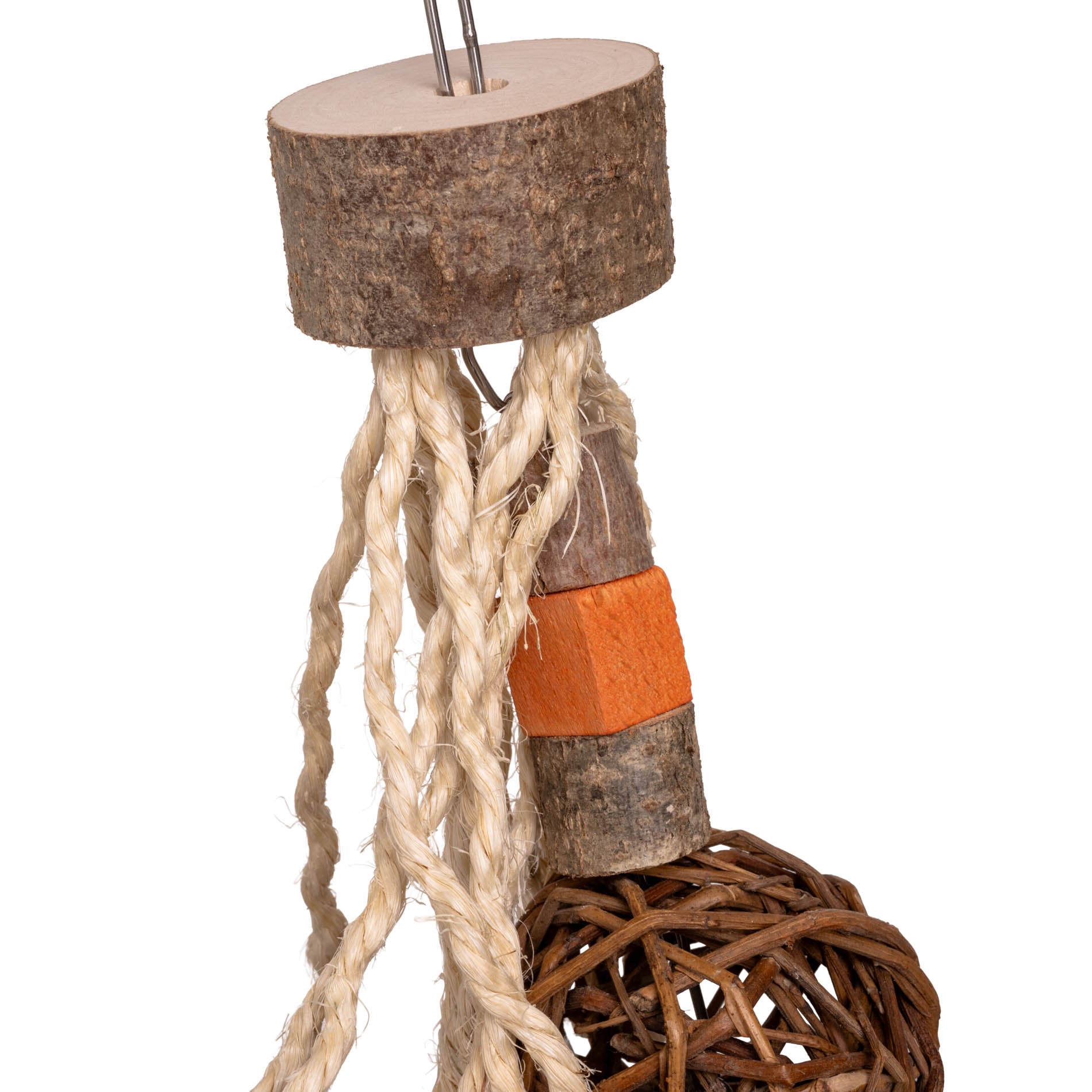 Die Kombination aus Holz, Weidenball und Sisal animiert zum Schreddern und Spielen, während die Edelstahlkette sicheren Halt in der Voliere bietet. Dieses natürliche Spielzeug fördert die Beweglichkeit, die Schnabelpflege und sorgt für abwechslungsreiche Beschäftigung im Vogelzimmer oder in der Voliere.