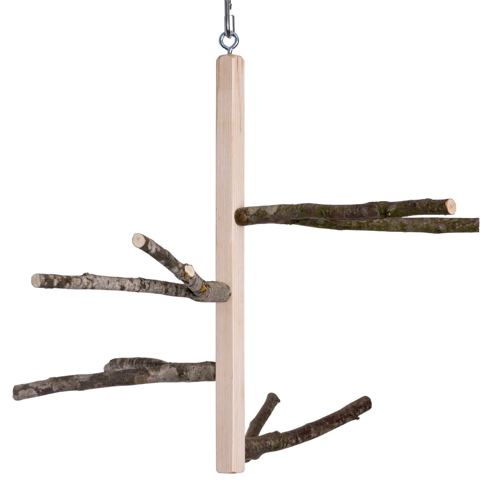 An der stabilen Mittelstange sind vier verzweigte Natursitzstangen befestigt, die zum Klettern, Ausruhen und Schaukeln einladen. Die natürliche Schaukelbewegung unterstützt spielerisch die Beweglichkeit und den Gleichgewichtssinn deiner Vögel.