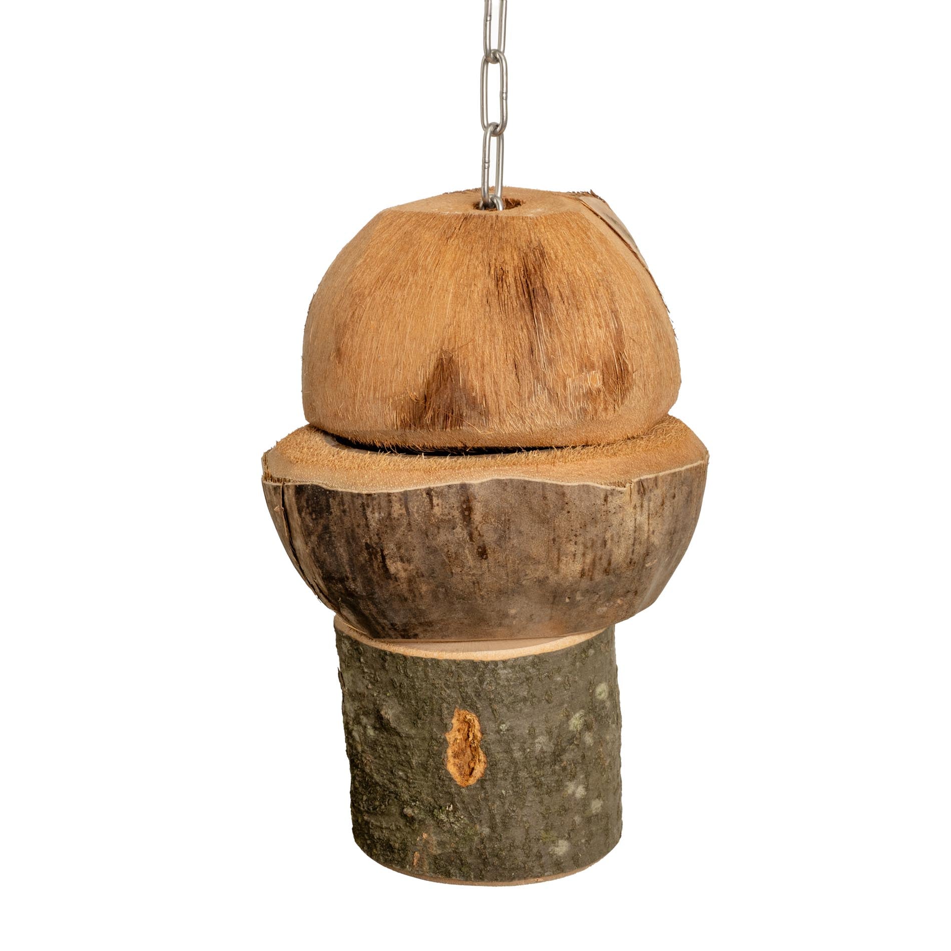 Das Highlight des Spielzeugs ist das Futterversteck: Die untere Kokosnuss dient als Behältnis für Leckereien, während die obere Kokosnuss beweglich ist und nach oben geschoben werden kann. So müssen die Papageien aktiv nachdenken, klettern und die Belohnung selbstständig freilegen – eine perfekte Kombination aus körperlicher und geistiger Beschäftigung.