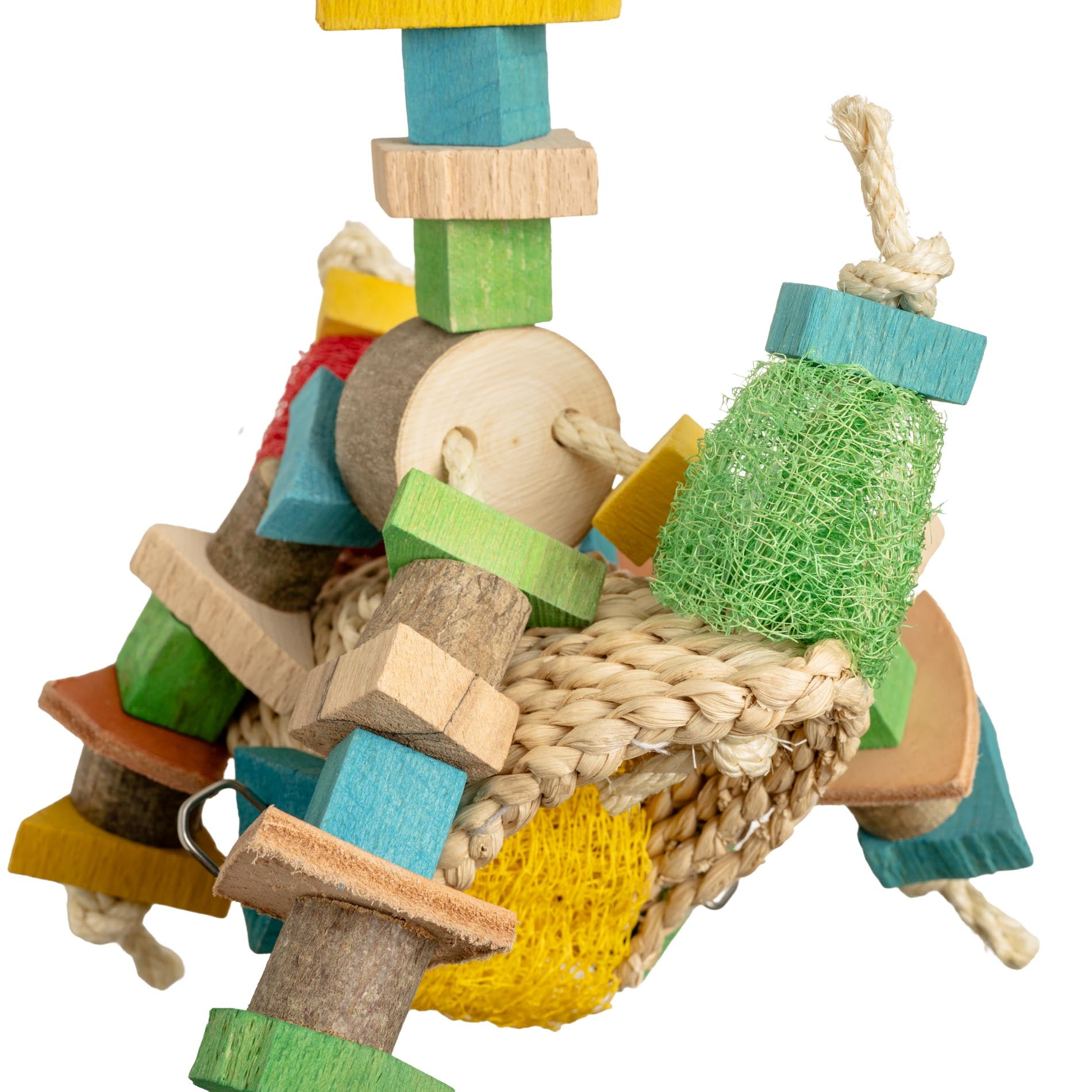 Dieses farbenfrohe Papageienspielzeug kombiniert eine stabile Strohmatte mit einer bunten Luffagurke und reichlich Knabberhölzchen auf Sisalschnur. Teilweise naturbelassen und teilweise mit lebensmittelechten Fruchtfarben gefärbt, bietet es euren Papageien abwechslungsreichen Beschäftigungsspaß zum Knabbern, Zupfen und Erkunden. Die Aufhängung erfolgt sicher über eine Edelstahlkette mit Edelstahlschraubhaken.