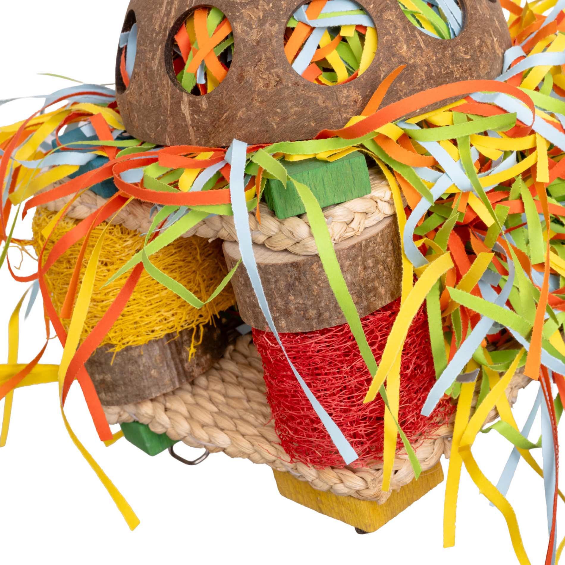 Dieses Spielzeug für Papageien kombiniert Strohmatten, Luffagurke, Holz und Kokos zu einem spannenden Knabber- und Schreddererlebnis. Ideal für Amazonen, Graupapageien, Kakadus und Aras.