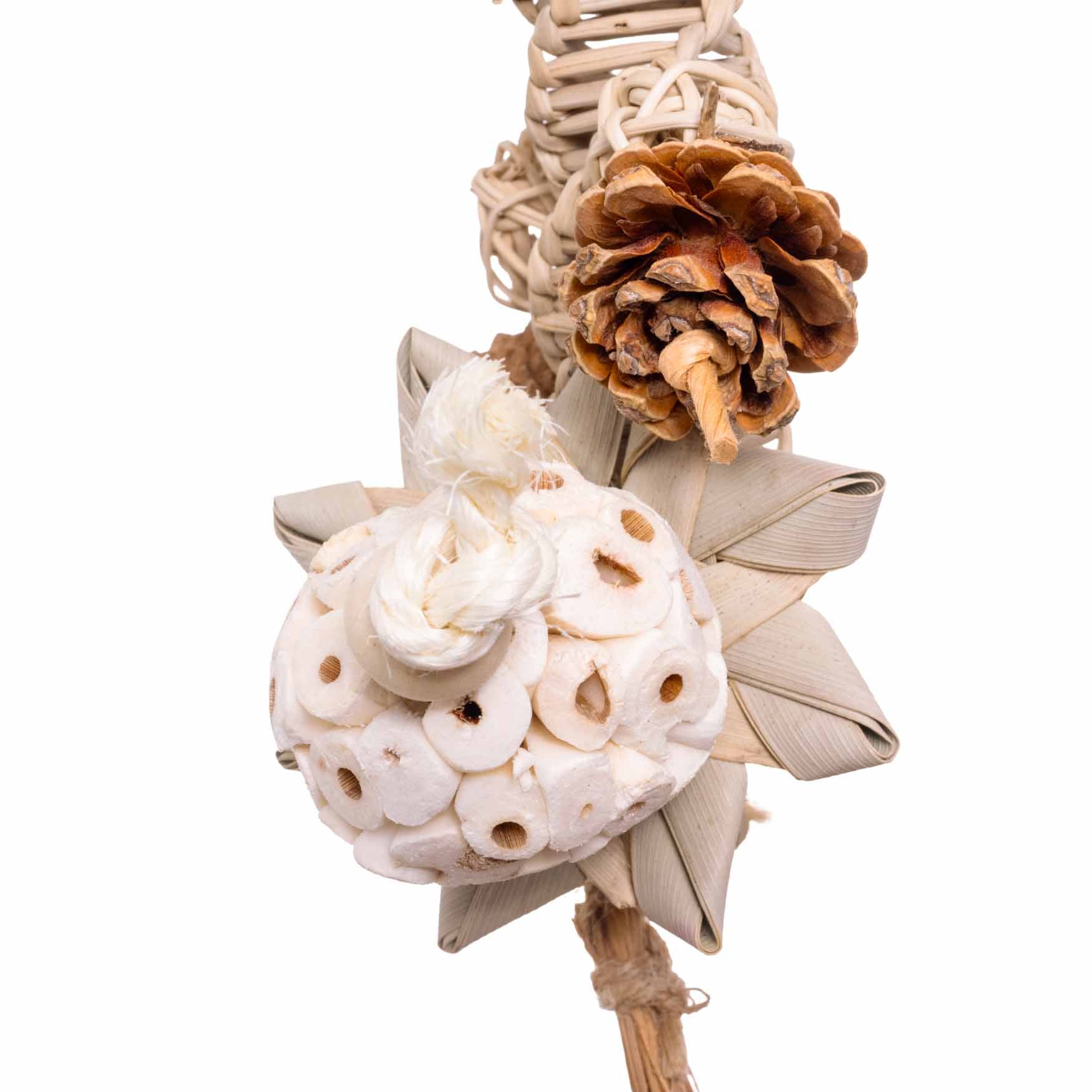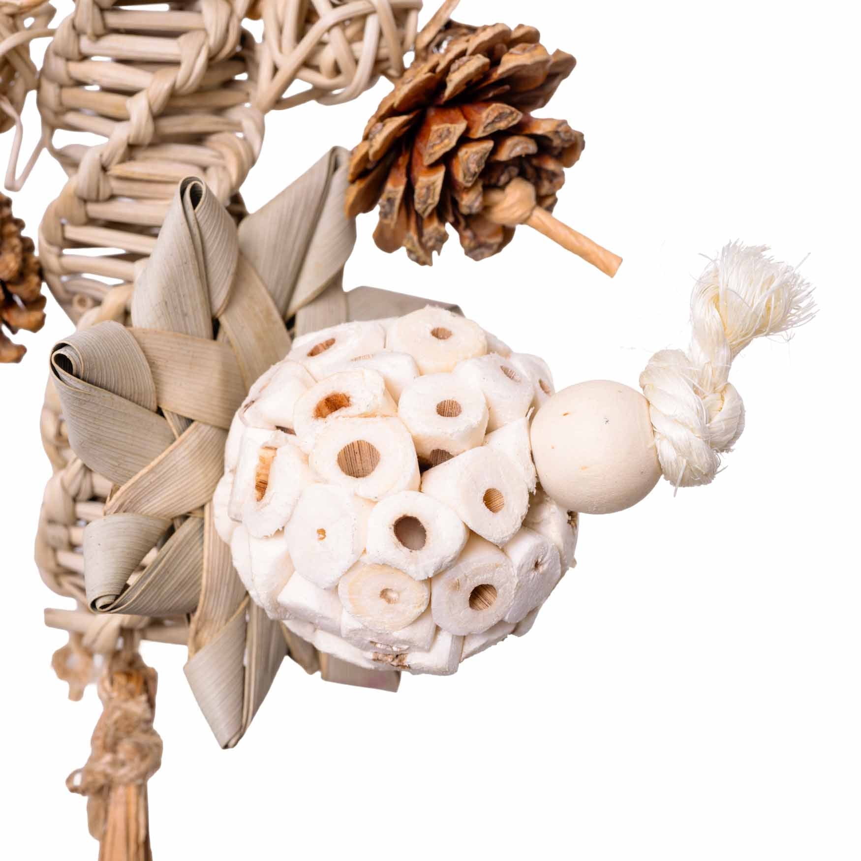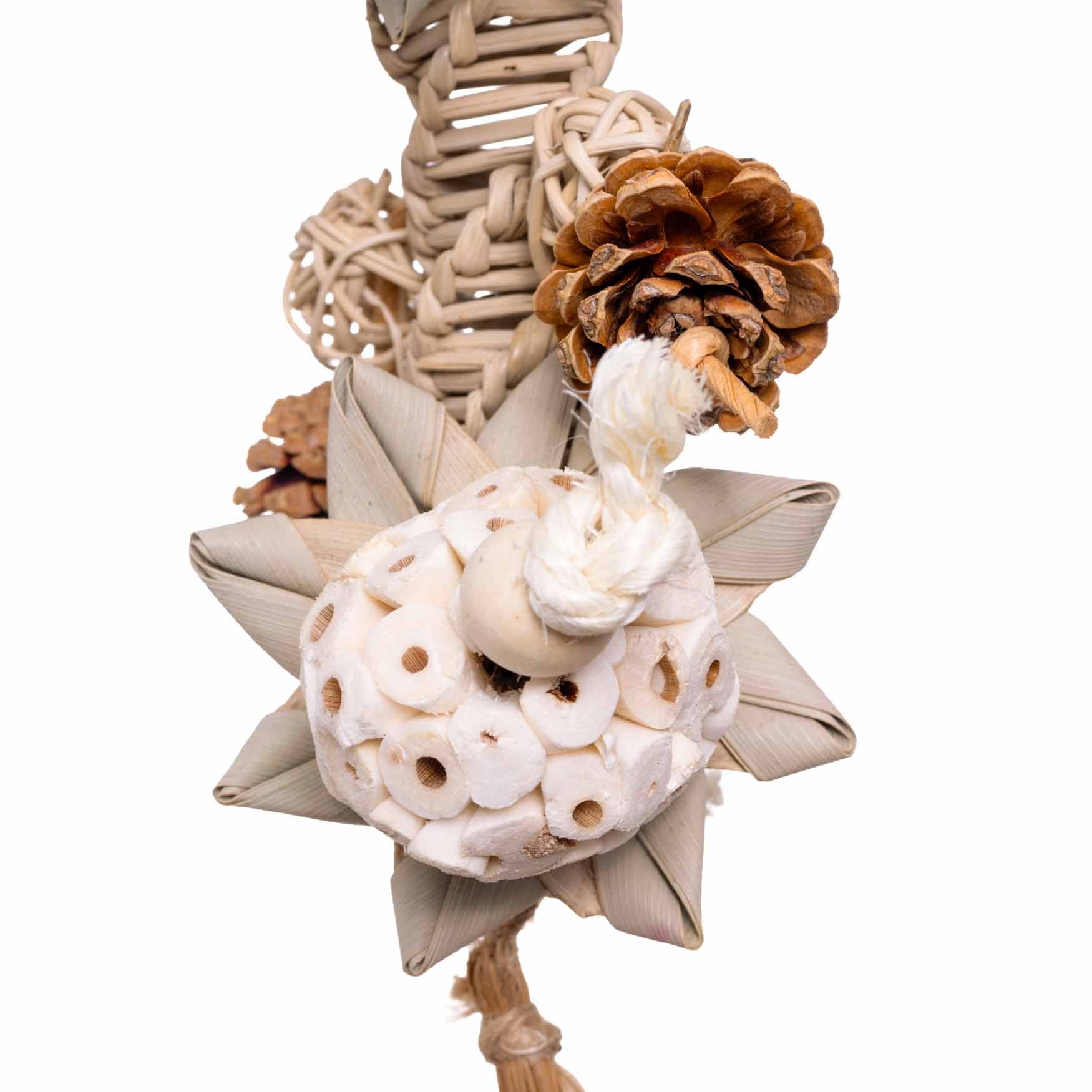 Durch die natürlichen Zwischenräume der Materialien eignet sich dieses Spielzeug auch ideal für Foraging. Kleine Leckerli können zwischen den Tannenzapfen oder in den Strukturen des Spielzeugs versteckt werden. So werden Papageien und Sittiche dazu angeregt, aktiv zu suchen, zu erkunden und sich länger mit dem Spielzeug zu beschäftigen – eine sinnvolle geistige und körperliche Auslastung.