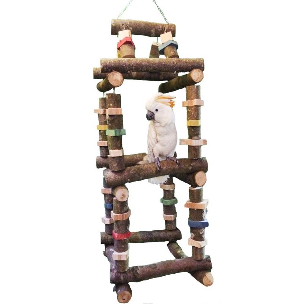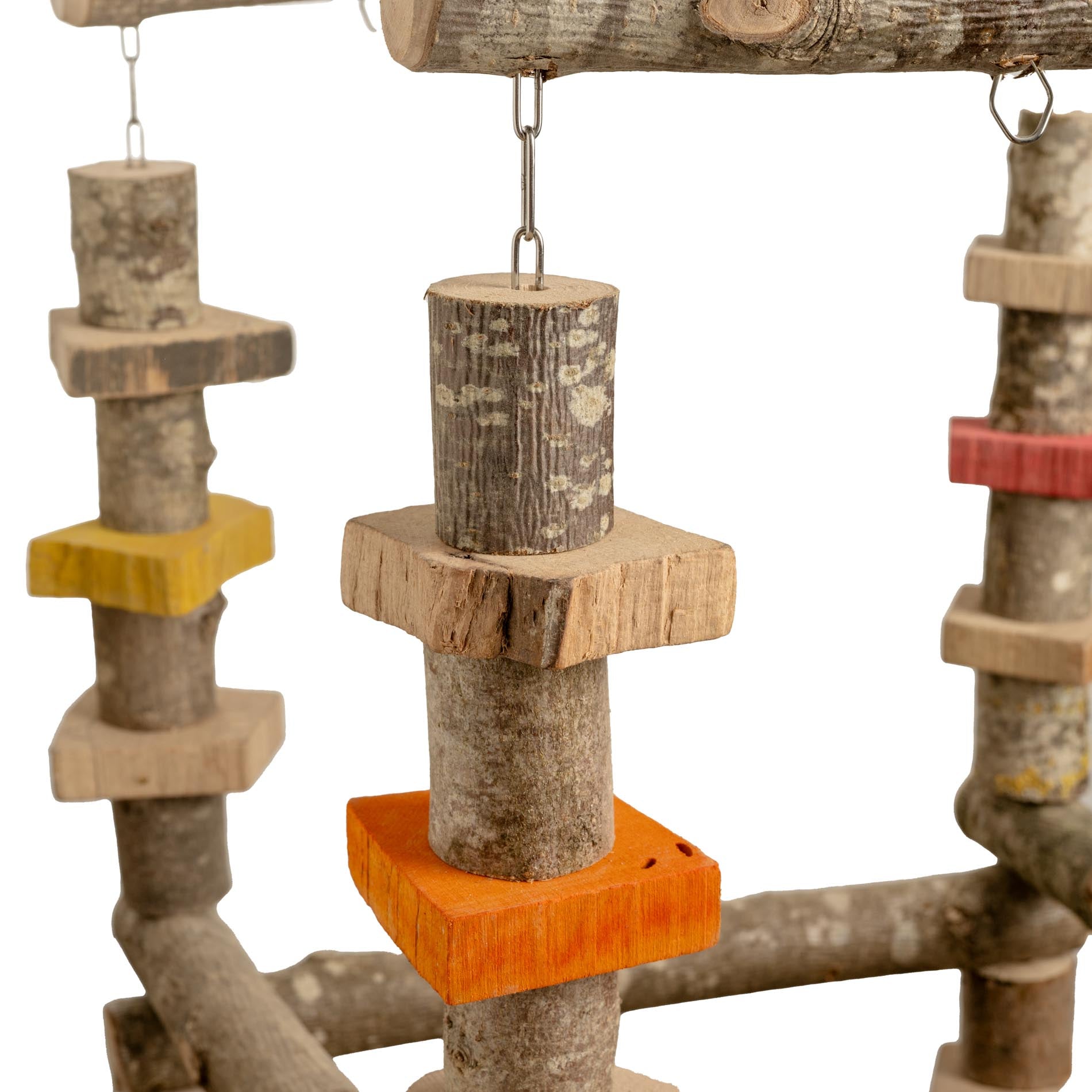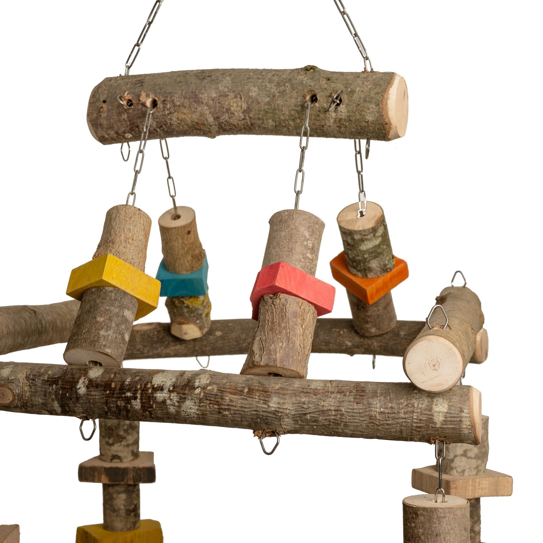 Mehrere Naturholzsitzäste mit ca. 4 cm Durchmesser, bunte Knabberhölzer (gefärbt mit lebensmittelechten Fruchtfarben) und durchgehende Edelstahlketten machen diesen Turm zu einem sicheren und abwechslungsreichen Spielzeug für große Vögel. Dank der robusten Edelstahlschraubhaken lässt sich der Turm zuverlässig in Voliere oder Zimmer befestigen.