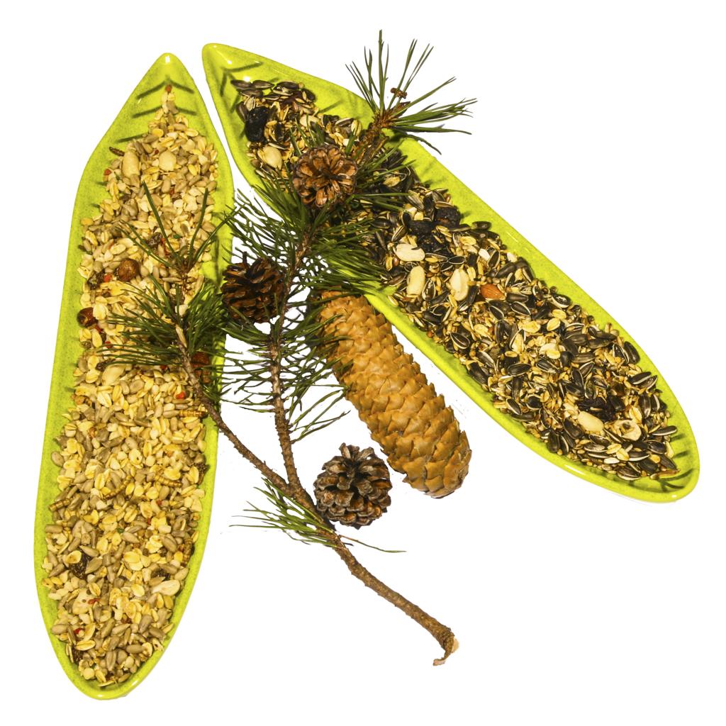 Sonnenblumen geschält, Haferflocken gefettet, Erdnussbruch, Rosinen, Bäckerei-Erzeugnisse, Fruchtbisquits, Mehlwürmer getrocknet