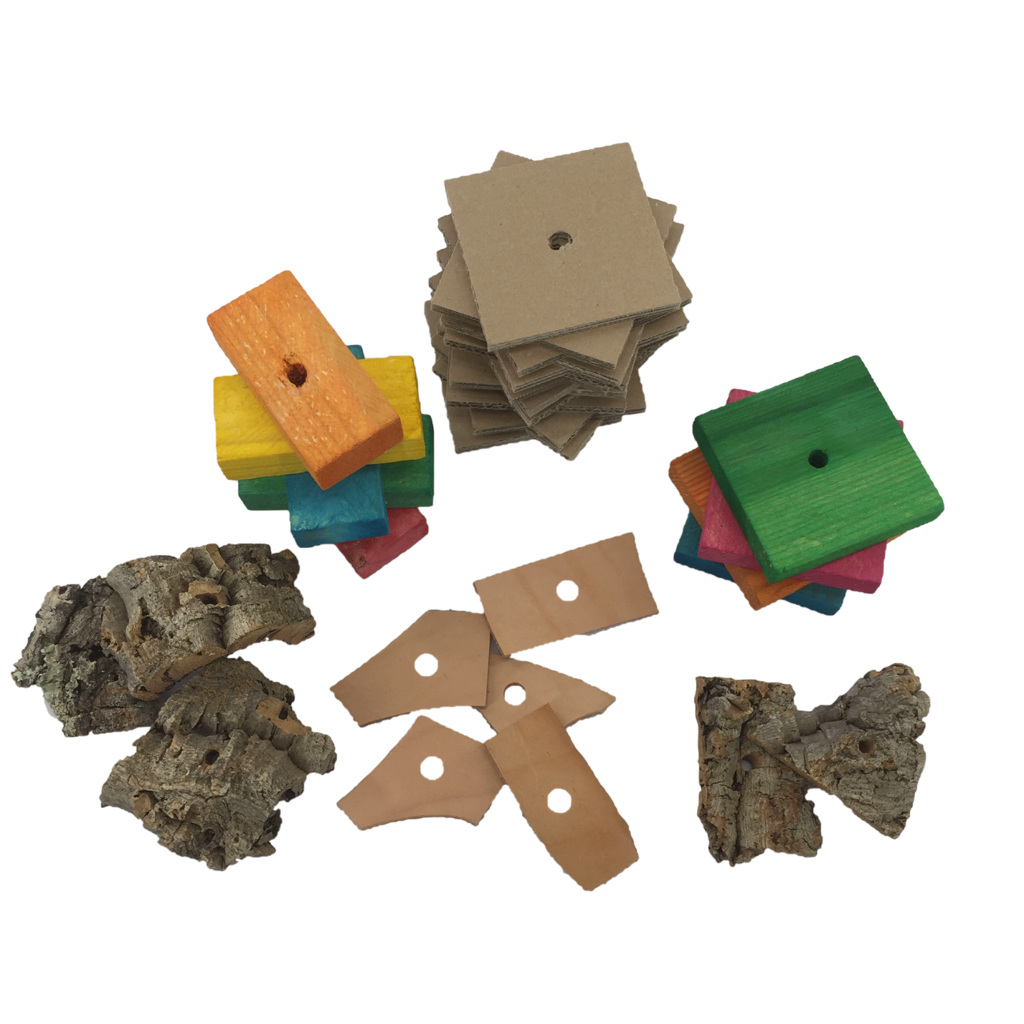 Papageien Spielzeug Material Kork, Leder, Pappe, Holzscheiben Hart- und Weichholzklötze.